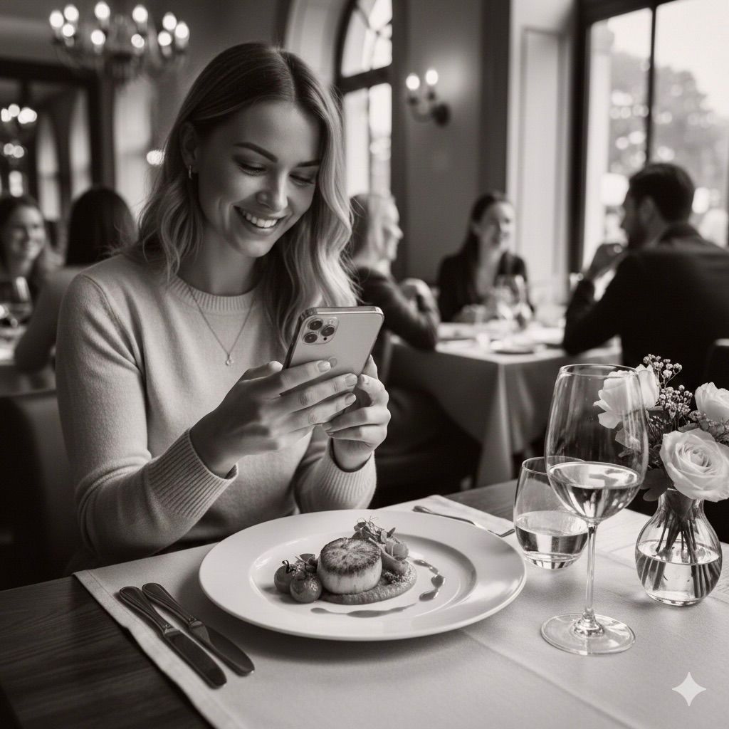 Minuten vergehen. Der Teller wird gedreht, das Licht korrigiert, die Serviette drapiert. Wenn der erste Bissen endlich den Mund erreicht, ist die Sauce lauwarm. Aber das Foto ist gespeichert. Für den Gast war das Essen in diesem Moment schon vorbei, bevor es begann.